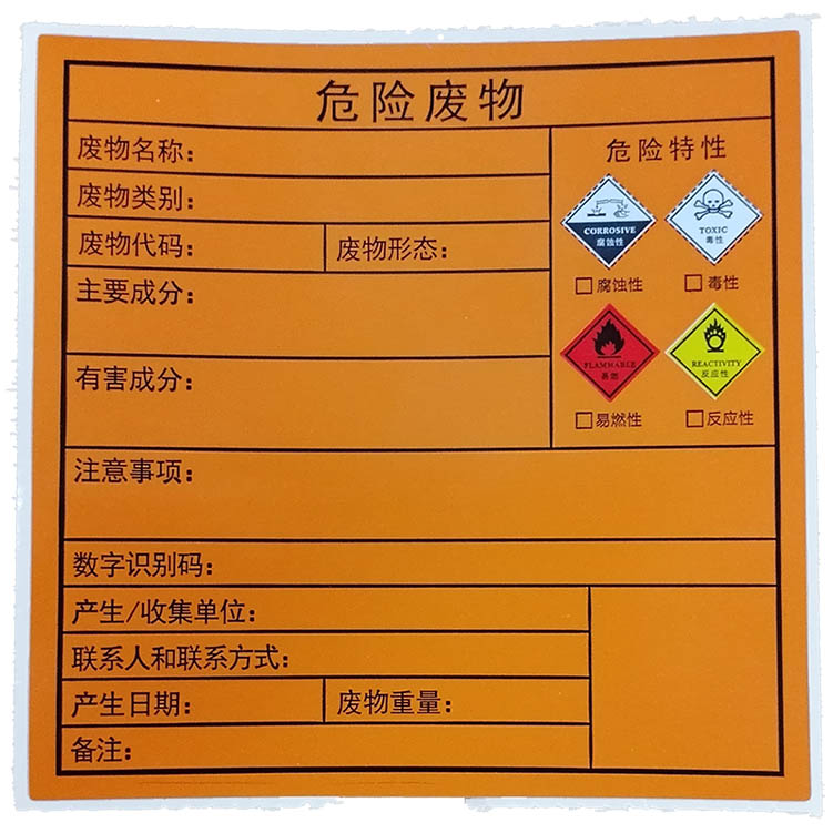 危險類別標識是另一個重要組成部分,它根據危險廢物的種類和性質來確定。例如,易燃廢物使用紅色背景和黑字的“易燃”標識;有毒廢物使用白色背景和黑字的“有毒”標識。對于具有多種危險類別的廢物,如既是有毒又是易燃的廢機油,應在標簽上體現所有相關的危險類別標識。